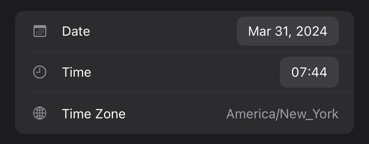 For example, if you are in New York and you add an expense on 2024-03-31 07:44 AM, the app will display the expense as 2024-03-31 07:44 AM in New York time. If you travel to London and you open the app, the app will display the expense as 2024-03-31 07:44 AM with the time zone of New York (America/New_York).