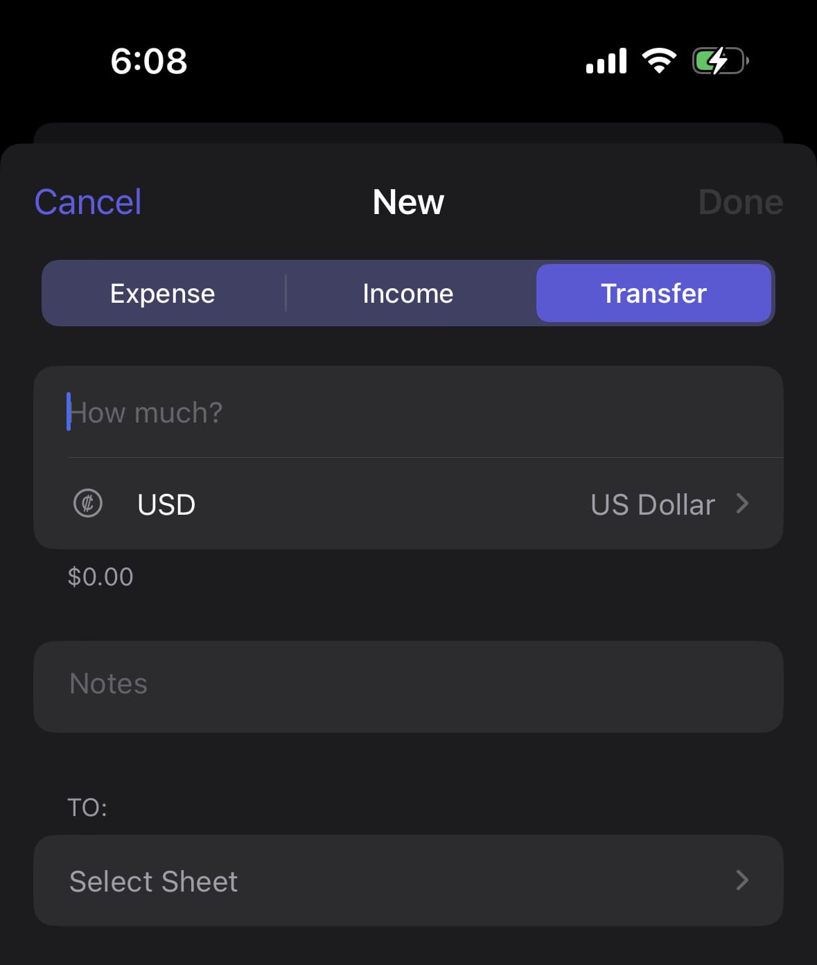 You can transfer money between sheets. This is useful when you want to transfer money from one sheet to another because you can record the transfer in both sheets using the Transfer category which is treated as a special category. If you edit the transfer, it will be reflected in both sheets.