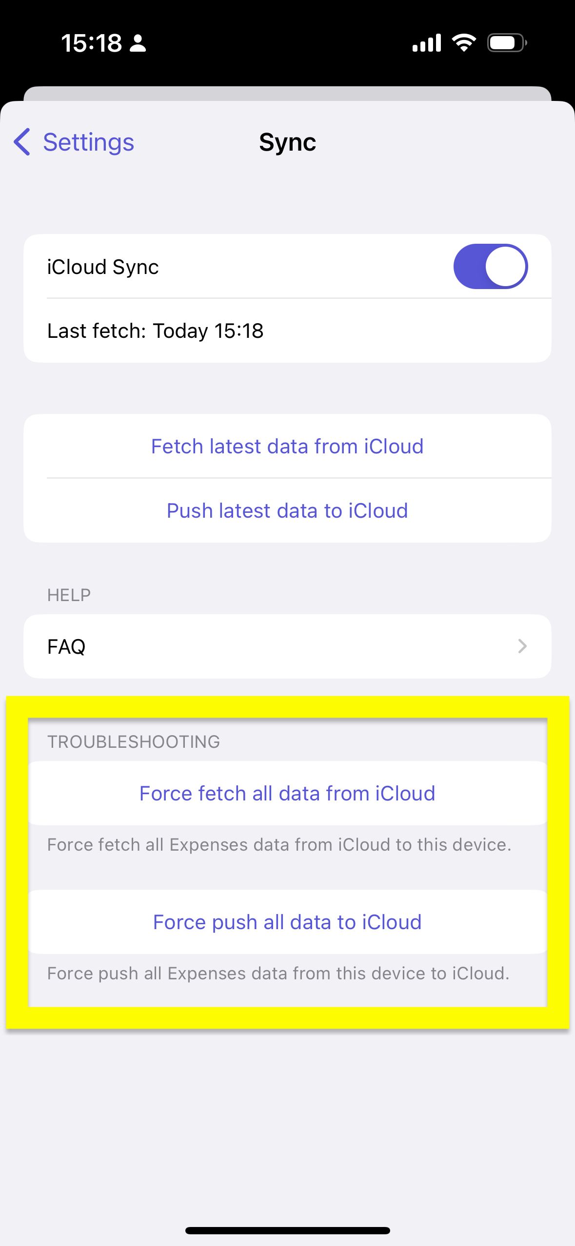 Settings (Expenses)→Sync - Make sure that you select the checkbox to enable iCloud Sync